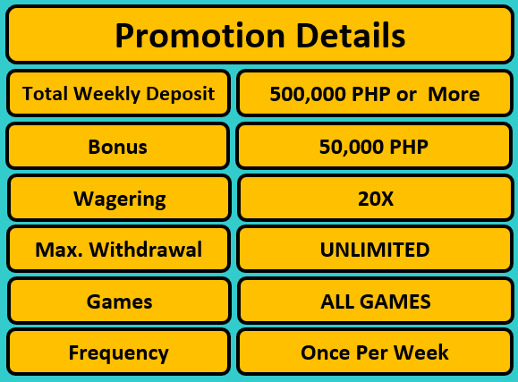 1. Deposit at least PHP 500,000 from Sunday to Saturday. Only weekly deposits are valid.
